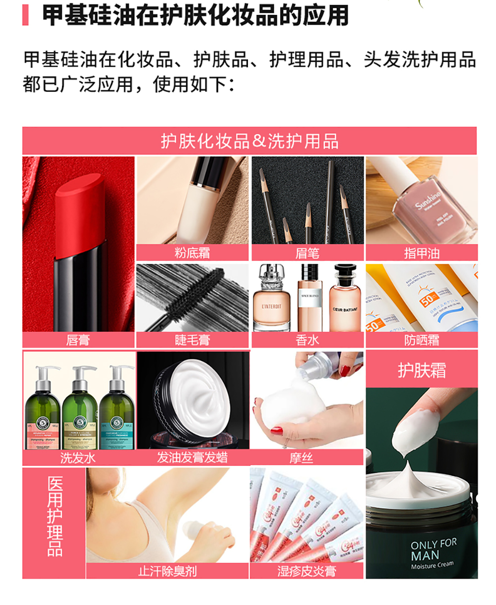 聚二甲基硅氧烷可用作润滑剂、脱模剂、消泡剂、柔软剂、防震剂、绝缘剂、光亮剂、填缝剂、防潮剂、介电液等,被广泛应用在医疗、食品、日化、家具、建材、纺织皮革、塑料橡胶、电子电气、汽车等行业中。